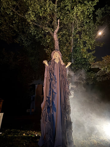 Includes hat and upper body, with extra long costume. You must mount to your own 8’ post, attached to your own stakes to create the oversized effect. Fog machine not included.
